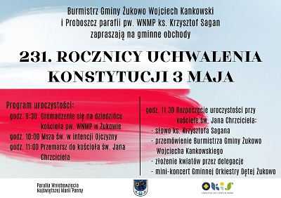 Serdecznie zapraszamy na uroczyste obchody 231 ROCZNICY UCHWALENIA KONSTYTUCJI 3 MAJA.