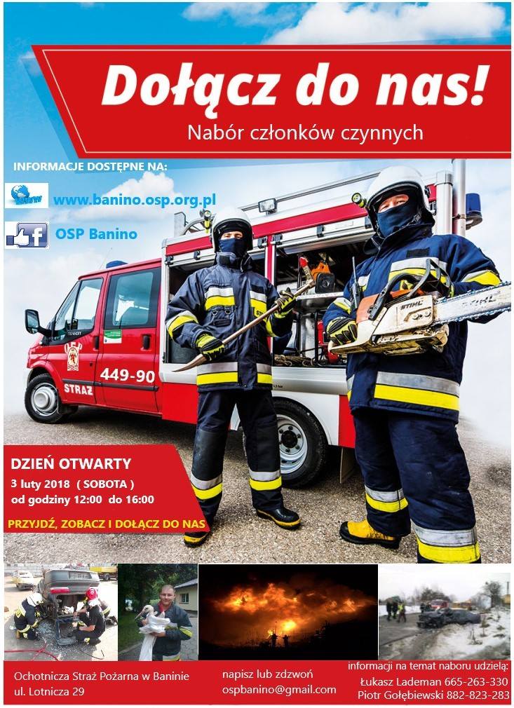 Wszystkie osoby pełnoletnie zamieszkujące naszą miejscowość chcące wstąpić w szeregi Rycerzy Floriana zapraszamy na dzień otwarty w dniu. 3 luty 2018 od godziny. 12:00 do 16:00 w strażnicy OSP w Baninie