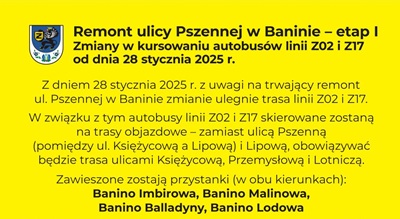 W związku z rozpoczęciem prac przy budowie ulicy Pszennej na czas wykonywania prac, zmianie ulega trasa i rozkład jazdy autobusów...