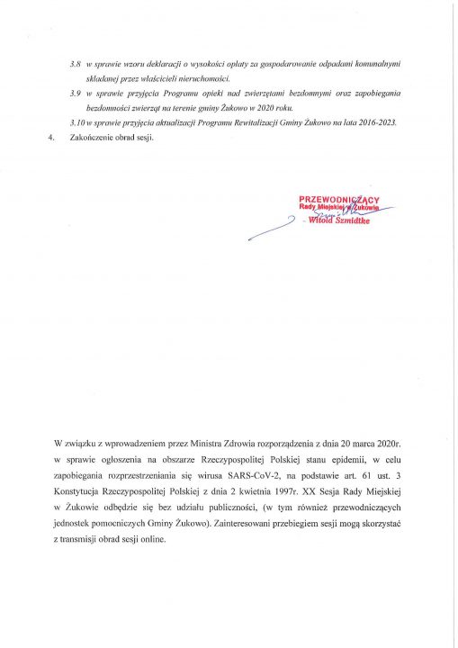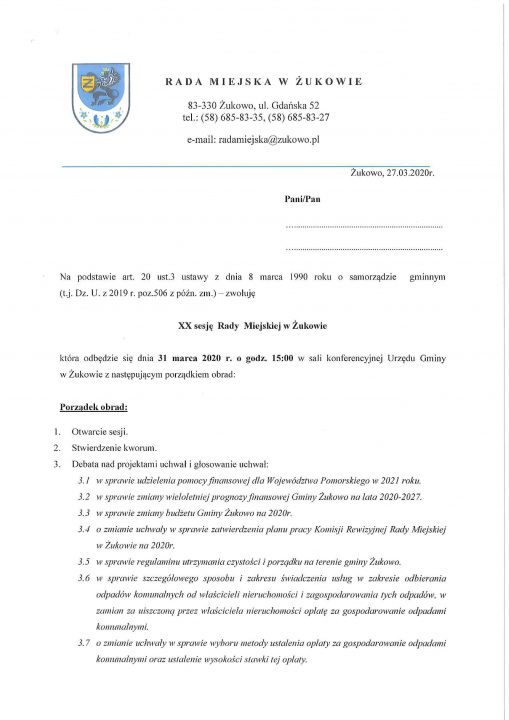 W dniu jutrzejszym tj. 31.03.2020r. odbędzie się nadzwyczajna sesja Rady Miejskiej w Żukowie, podczas której, między innymi podjęta (lub nie) zostanie UCHWAŁA o zmianie uchwały w sprawie wyboru metody ustalenia opłaty za gospodarowanie odpadami komunalnymi oraz ustalenie wysokości stawki tej opłaty. W sesji nie będą uczestniczyć sołtysi ani goście ze względu na pandemię korona wirusa.
