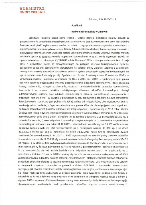 Informuję, iż za gospodarkę odpadami komunalnymi odpowiada Urząd Gminy w Żukowie a konkretnie Referat Środowiska i Rolnictwa i tam winien Pan skierować swoje uwagi. Ponadto to Rada Miejska decyduje o uchwaleniu regulaminu czystości i wysokości opłat za odpady.