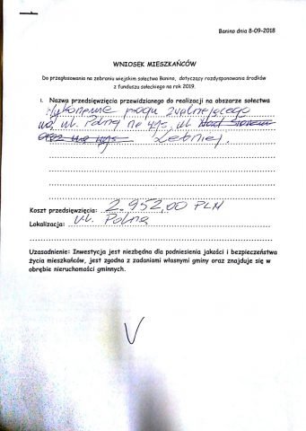 Wnioski zostały przyjęte i będą poddane (każdy z osobna) pod głosowanie w dniu zebrania wiejskiego. Wszystkie pięć wniosków opiewa razem na kwotę 95 752zł jest to 1/3 Funduszu Sołeckiego!!!