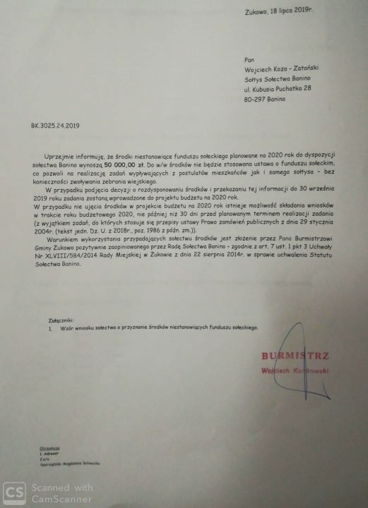 Jednocześnie Rada Miejska w Żukowie podjęła decyzję o przeznaczeniu dodatkowych środków finansowych niestanowiących Funduszu Sołeckiego. Do dyspozycji Sołectwa Banino, jest to kwota 50 000zł. Kwota ta odmiennie do FS nie podlega pod ustawę o funduszu sołeckim i jest środkami, które mogą być rozdysponowane przez Sołtysa w ciągu roku bez konieczności zwoływania zebrania wiejskiego. Dzięki tego typu zabezpieczeniu finansowemu Sołectwa, będziemy mogli interweniować na niespodziewane wydatki a także wspierać lokalne inwestycje i przedsięwzięcia bez konieczności spełniania licznych formalnych warunków i obostrzeń.