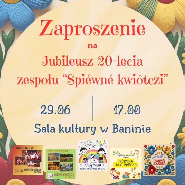 „Serdecznie zapraszamy na ostatni seans Festiwalu Filmów Kaszubskich w najbliższą niedzielę 29 czerwca o godz. 17.00 na Sali Kultury w Baninie. Bardzo ważnym punktem popołudnia będzie promocja nowej – piątej już – płyty zespołu „Spiéwné Kwiôtczi” oraz jubileusz 20-lecia zespołu. Zespół ma ogromne zasługi w kreowaniu wyłącznie nowych kaszubskich utworów. Jest ich około 100. Mnóstwo z nich jest już obecnych w nauczaniu języka kaszubskiego.”