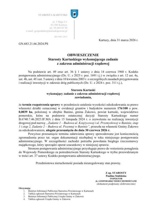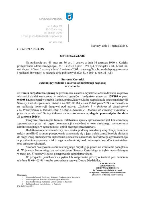 OBWIESZCZENIA w sprawie odszkodowań za działki pod budowę ulic Pszenna, Księżycowa, Przemysłowa. przez Wojciech Koza-Zatoński · 2026-04-10 Załączniki Plik Opis Pobrania 2026.03.31_obwieszczenie_termin_GN.683.21.66.2024.PS (1) 3 31.03.2026_Obw._termin_GN.683.21.27.2024.DN (1) 4 31.03.2026_Obw._termin_GN.683.21.5.2024.DN (1) 1 2026.03.31_obwieszczenie_termin_GN.683.21.37.2024.PS (1) 2 Podziel się: Share on Facebook (Otwiera się w nowym oknie) Facebook Share on X (Otwiera się w nowym oknie) X Dodaj do ulubionych:Lubię Wczytywanie…