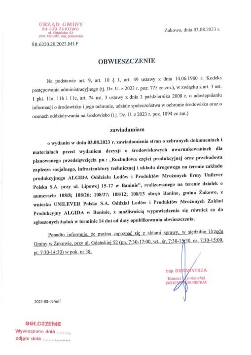 OBWIESZCZENIE przez Wojciech Koza-Zatoński · 2023-08-04 Załączniki Plik Opis Pobrania Obwieszczenie 425