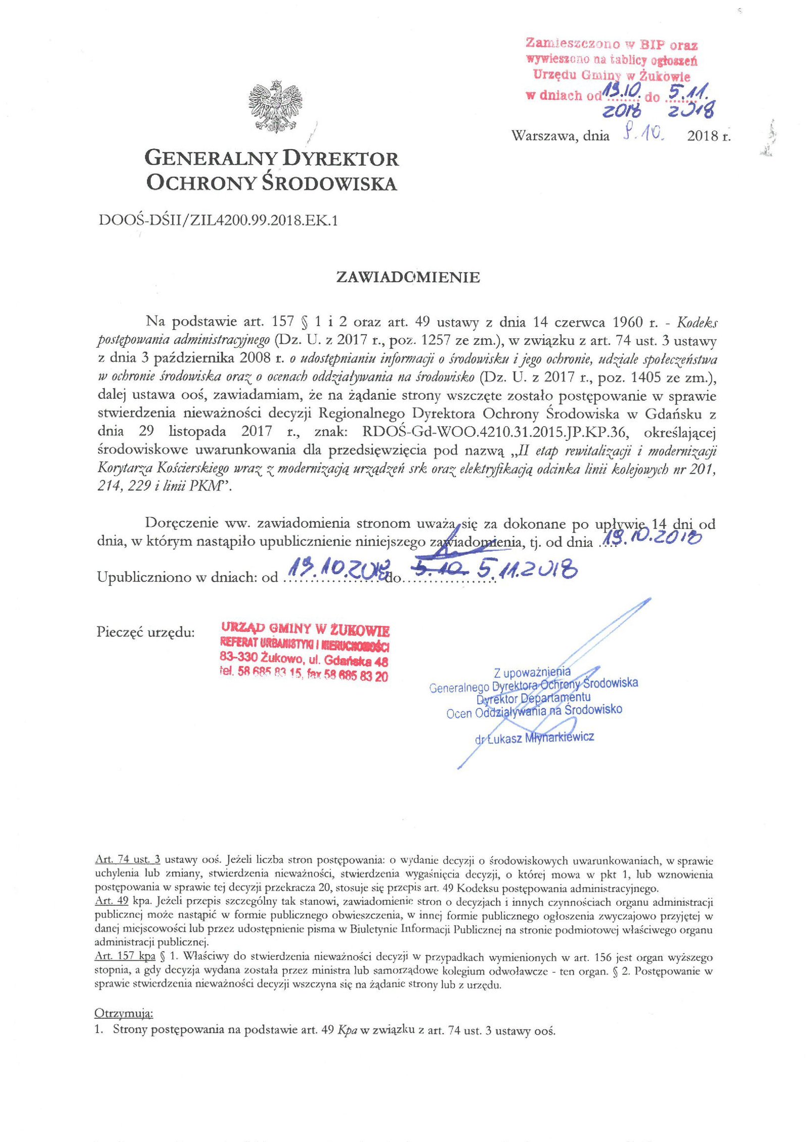 o wywieszeniu na tablicy ogłoszeń w Urzędzie Gminy w Żukowie w dniach od 13.09.2018 r. do 27.09.2018 r. zawiadomienia Generalnego Dyrektora Ochrony Środowiska, znak: DOOŚ-DŚII/ZIL4200.99.2018.EK.1 z dnia 09.10.2018 r.