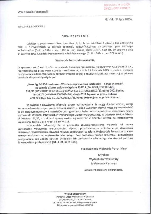 Informujemy w sposób zwyczajowo przyjęty o wywieszeniu na tablicy ogłoszeń w Urzędzie Gminy w Żukowie w dniach od 26.08.2025 r. do 09.09.2025 r. Obwieszczenia Wojewody Pomorskiego Nr WI-V.747.1.2.2025.SM.d z dnia 24.07.2025 r. dot. wszczęcia postępowania administracyjnego w sprawie wydania decyzji o ustaleniu lokalizacji inwestycji w zakresie terminalu dla przedsięwzięcia pn.: „Gazociąg DN300 Juszkowo-Wiczlino, naprawa wad i defektów – 3 grup anomalii”, na terenie działek ewidencyjnych nr 134/15 (KW GD1R/00000674/8), 132/30 (KW GD1R/00068089/4) i 132/32 (KW GD1R/00028503/1), obręb 0001 Banino i nr 287/4 (KW GD1R/00036545/6) obręb 0014 Pępowo w gminie Żukowo oraz nr 348/1 (KW GD1W/00059208/3), obręb 0019 Bojano w gminie Szemud.
