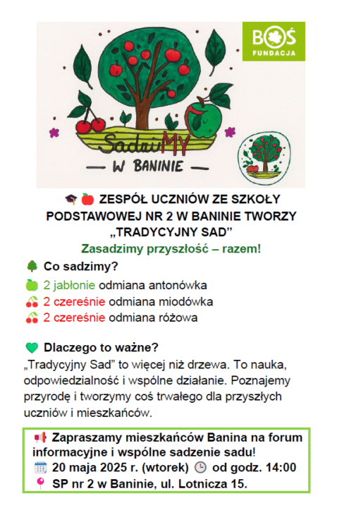 📅 Zapraszamy serdecznie wszystkich mieszkańców Banina na spotkanie informacyjne i wspólne sadzenie sadu!