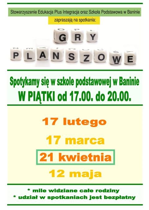 Zapraszamy na rodzinne spotkanie z „Planszówkami” przez admin · 2017-04-19 W najbliższy piątek 21 kwietnia od 17.00 do 20.00 Podziel się: Share on Facebook (Otwiera się w nowym oknie) Facebook Share on X (Otwiera się w nowym oknie) X Dodaj do ulubionych:Lubię Wczytywanie…