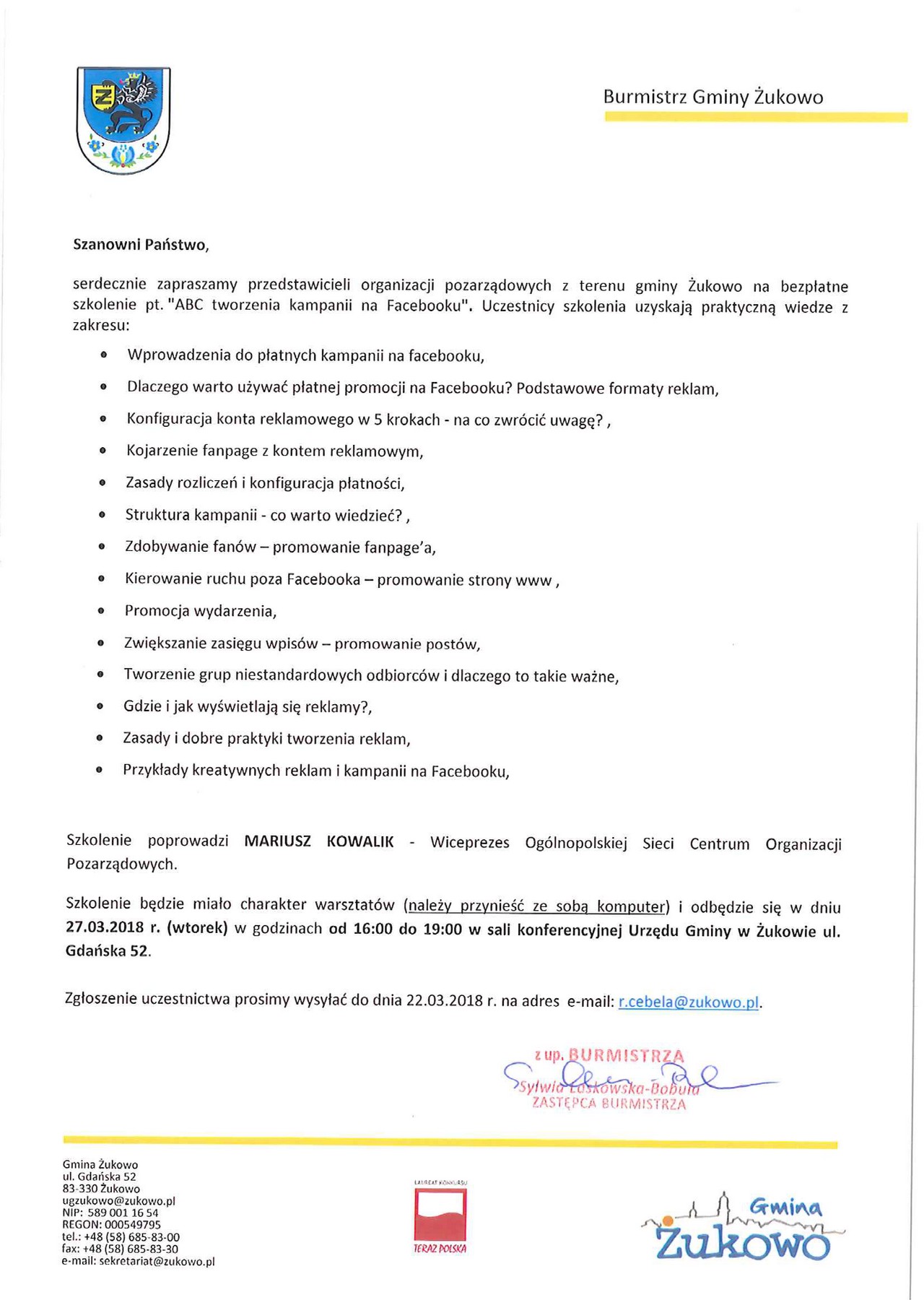 Zgłoszenie uczestnictwa prosimy wysyłać do dnia 22.03.2018 r. na adres e-mail: r.cebela@zukowo.pl.