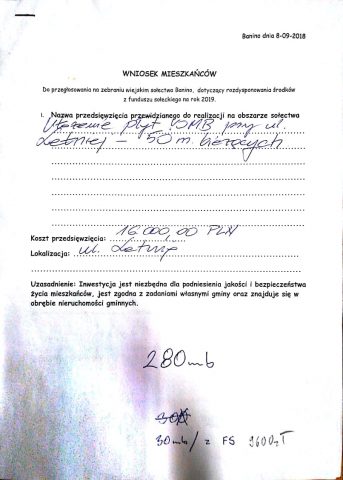 Zbliża się termin zebrania Sołeckiego, na którym będziemy wspólnie podejmować decyzje, na co przeznaczymy środki pochodzące z Funduszu Sołeckiego 2019r. Podobnie jak w zeszłym roku przeprowadziliśmy konsultacje społeczne, na których, wspólnie decydowaliśmy nad kształtem jednego dużego wniosku mieszkańców i Rady Sołeckiej. Spotkania były merytoryczne oraz odbywały się w sympatycznej atmosferze, mieszkańcy przychodzili z propozycjami, nad którymi wspólnie dyskutowaliśmy. W trakcie wspólnej pracy został przygotowany wniosek, którego ostateczną formę przed przedłożeniem pod głosowanie omówimy jeszcze raz w dniu 20.09.2018 O godz. 1900 na ostatnich konsultacjach. Wniosek zawiera inwestycje mające wpływ na życie każdego mieszkańca Banina. Inwestycje, które zostały w nim ujęte zostały rozłożone na każdy fragment Banina. W trakcie spotkań przygotowaliśmy również Wnioski do Budżetu Gminy na rok 2019.