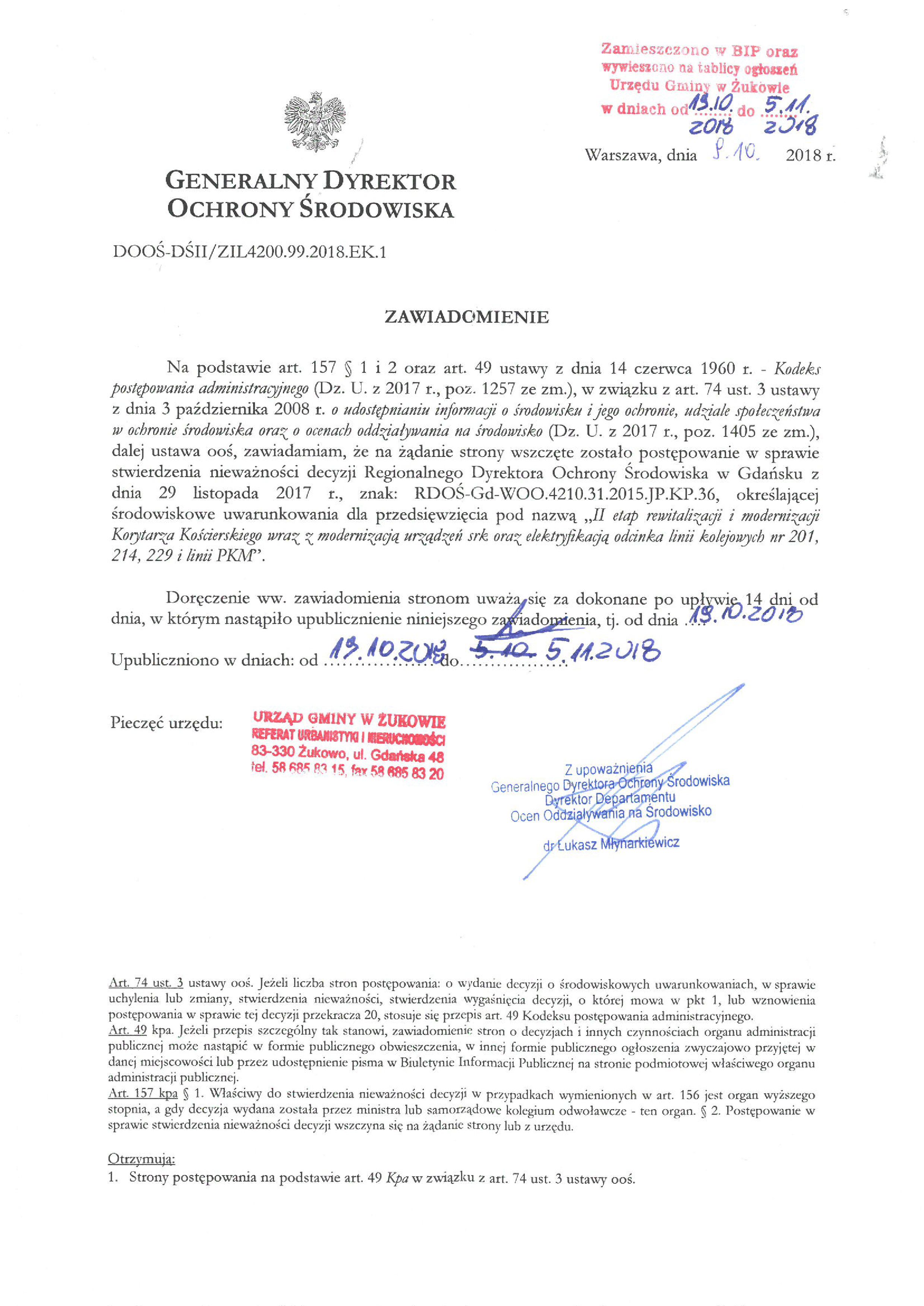 o wywieszeniu na tablicy ogłoszeń w Urzędzie Gminy w Żukowie w dniach od 13.09.2018 r. do 27.09.2018 r. zawiadomienia Generalnego Dyrektora Ochrony Środowiska, znak: DOOŚ-DŚII/ZIL4200.99.2018.EK.1 z dnia 09.10.2018 r.
